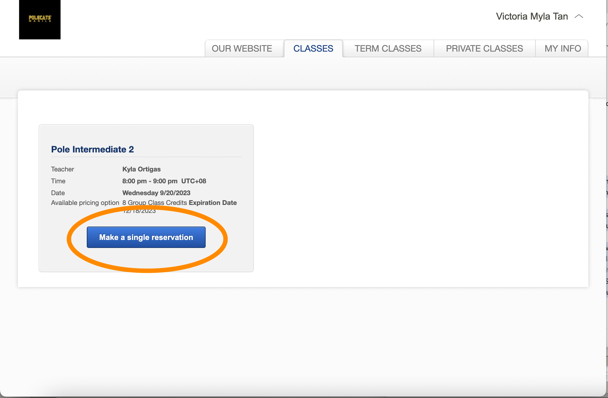 To solve this, you can cancel your October 8 class first, and then book the one on October 2. This works if no other classes booked on that package. If you have a lot of other classes booked on the package and are in crisis (!!), you can also send us an email info@polecatsmanila.com with subject: HELP WITH FIRST CLASS BOOKED. Include a background on what you're trying to book, so we can assist in either booking that class for you, or changing the validity of your package.